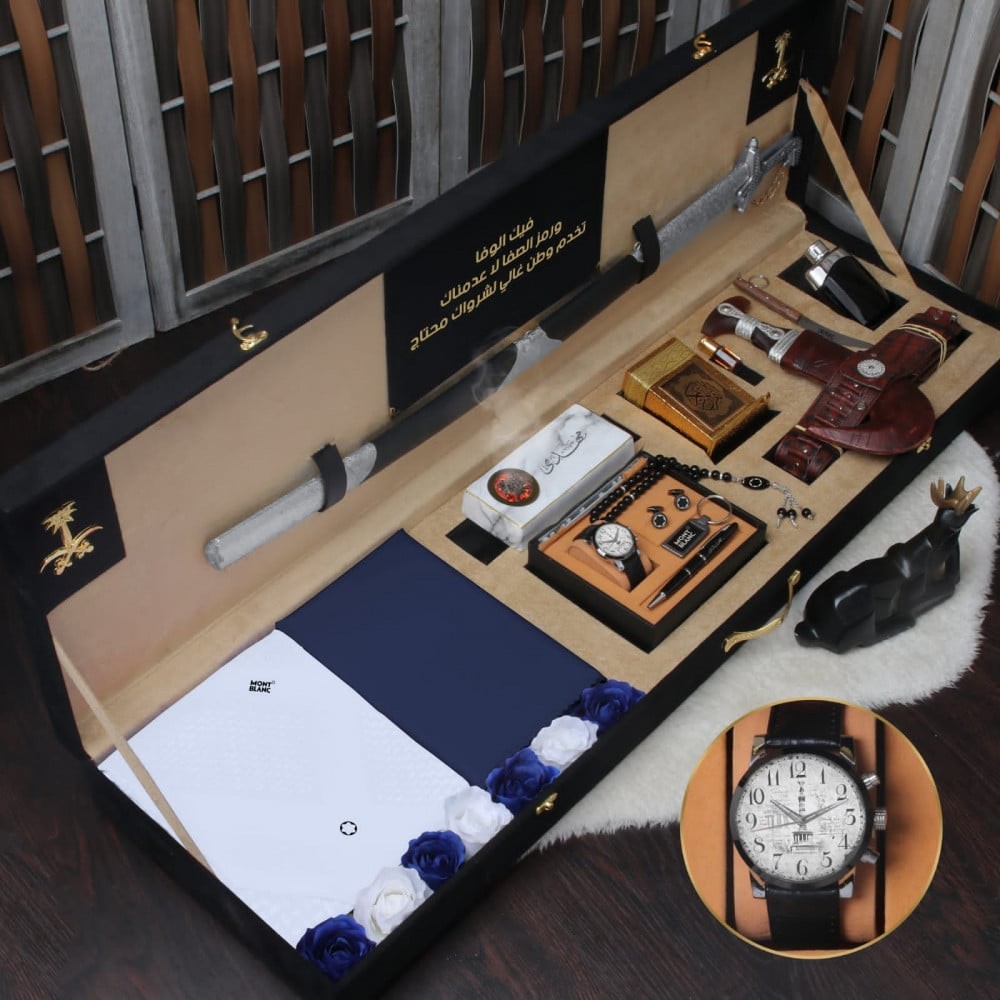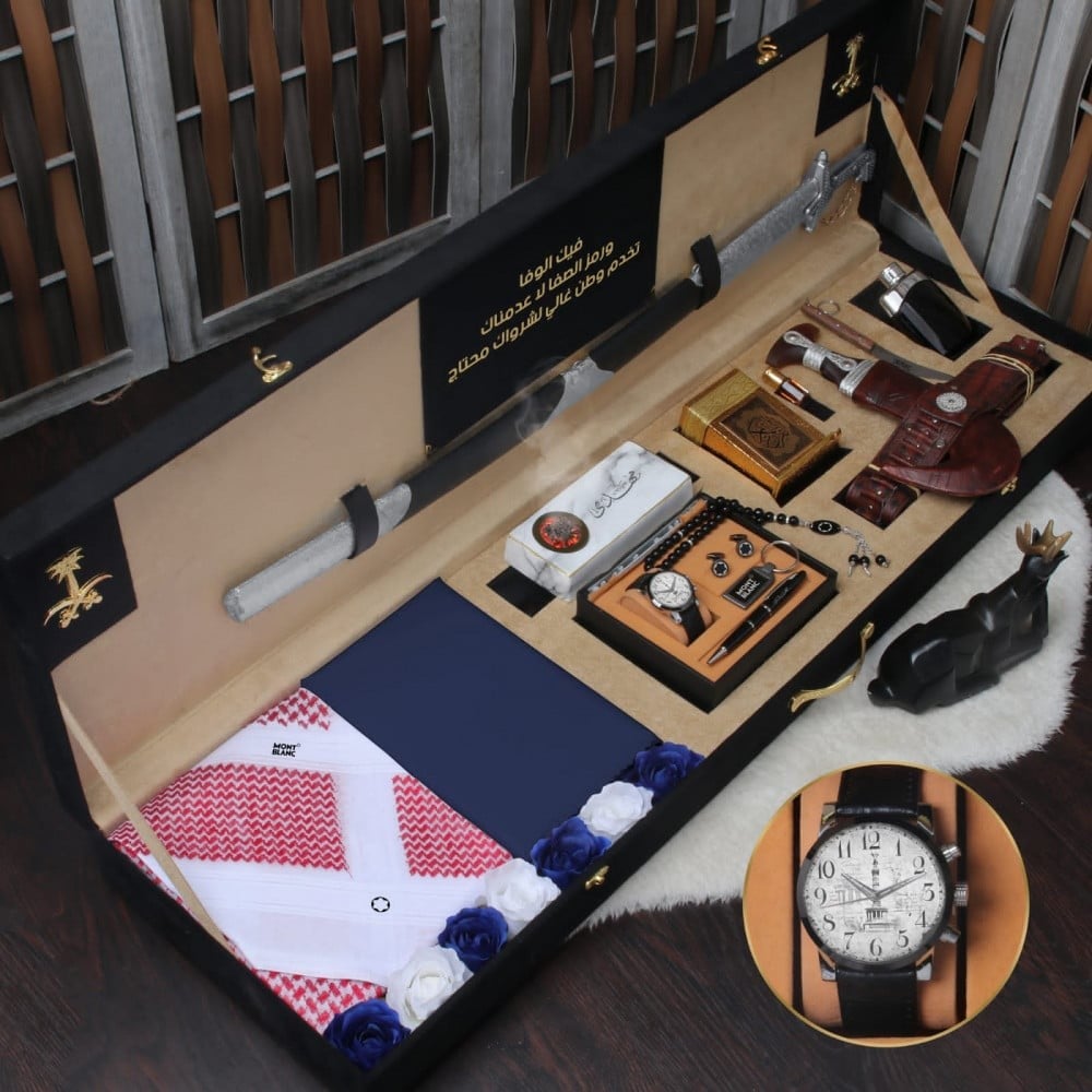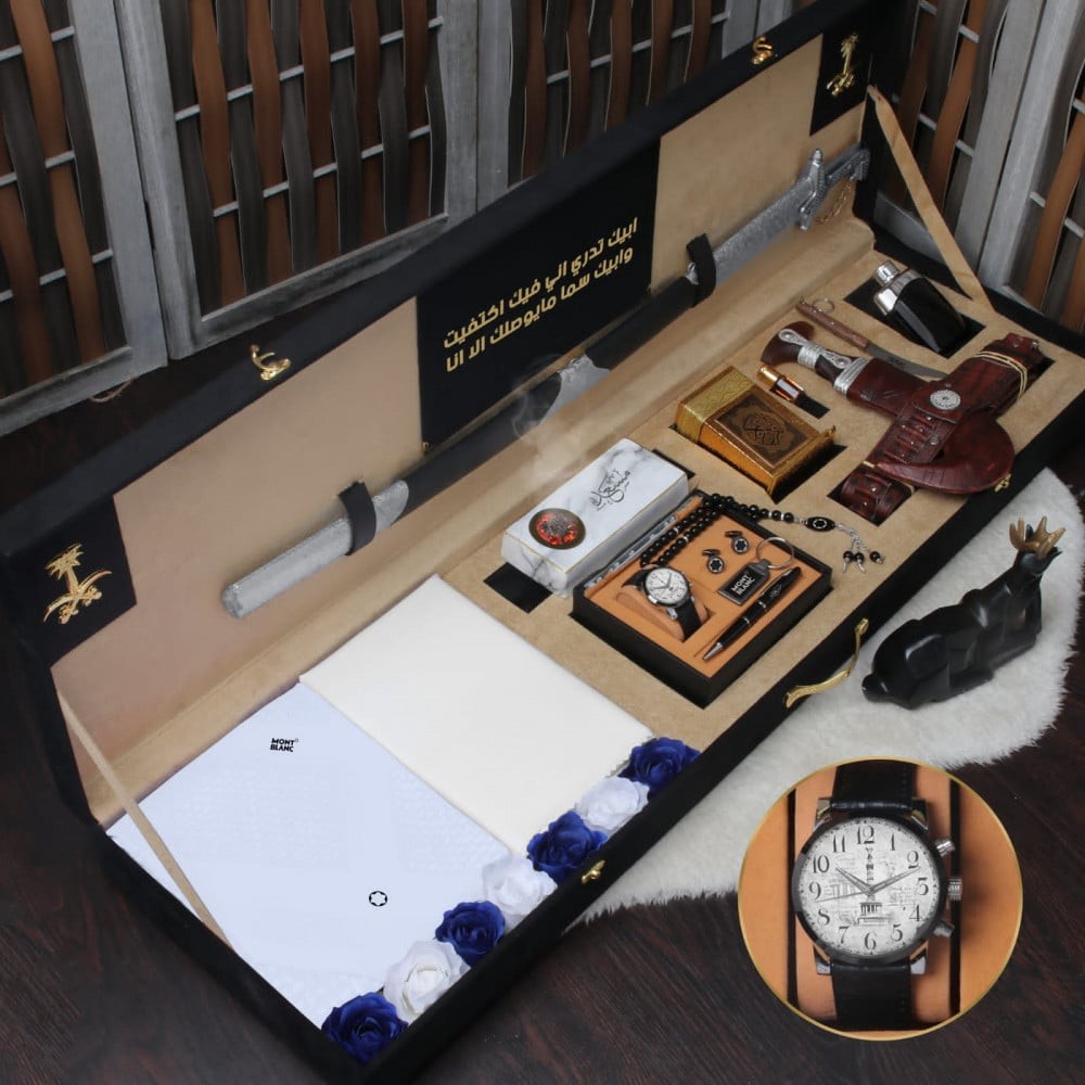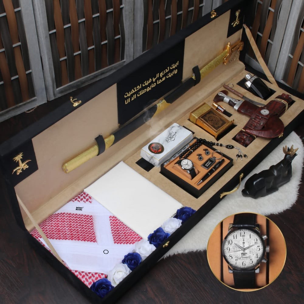بوكسات مونت بلانك رجالي فاخر يشمل سيف خنجر وشماغ مجموعة إكسسوارات راقية ومتكاملة بإسمك أو بإسم من تحب