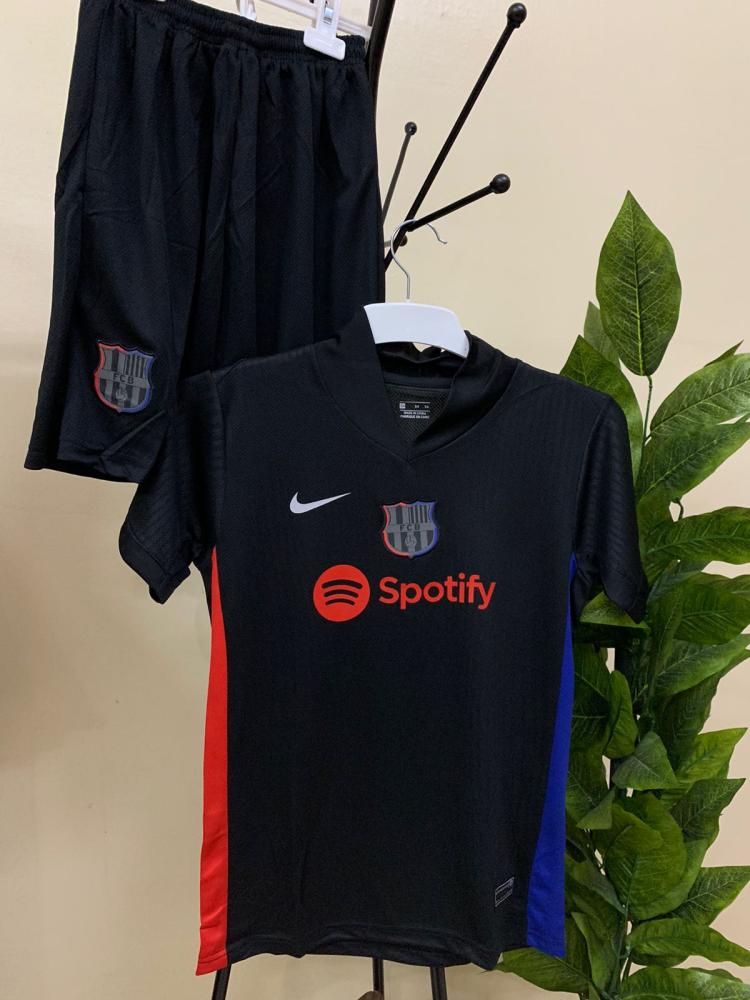 التيشرت : باللون الأسود بالكامل، مع شعار نادي برشلونة المميز الجوانب مزينة بخطوط باللونين الأحمر والأزرق،